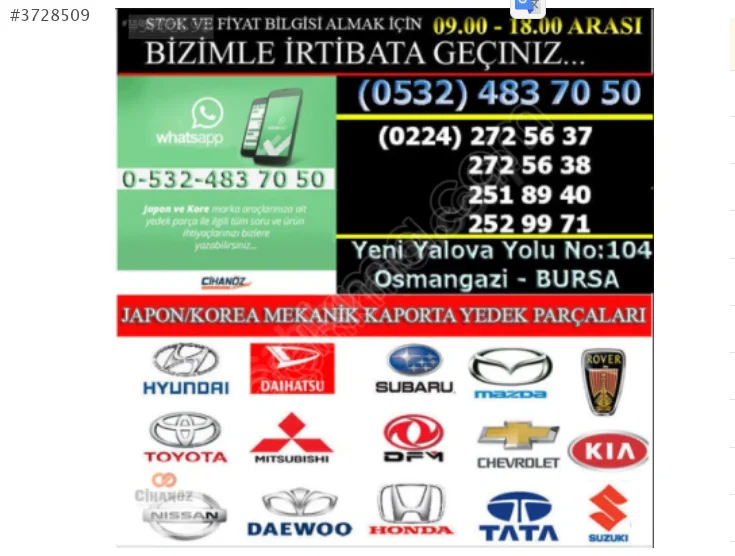 CİHANÖZ OTOMOTİV BURSA JAPON / KOREA MEKANİK-KAPORTA OTO YEDEK PARÇA